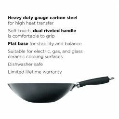Made of carbon steel and nonstick interior coating this Wok is ideal for your cooking needs. It has a soft touch riveted handle making it easier to hold. Non stick is PFOA free so that it is better for the environment. Wok has a flat bottom for better balance and is suitable for all heat sources, including induction.