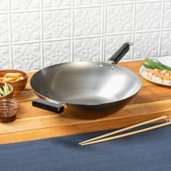 This Professional Series carbon steel wok might require an update to your will. Because family will want something special you made on your own, something you aged with each meal you cooked, something you imbued with a flavorful seasoning and a special character that’s uniquely your own. So you see, this classic cookware is destined to become your very own heritage piece, joining the ranks of that cherished tea pot or timeless carving knife. No two uncoated carbon steel woks age quite the same way. While they begin their life in your kitchen shiny and bright, the more you use them, the more they evolve, developing a unique seasoning to the surface. Yes, the metal will darken. But do not be alarmed! This is all part of the process, which could take a few months before the pan turns completely black, like a cast iron pan, but without the bulk and brittleness common to that composition. Carbon steel is lighter, stronger, thinner, and smoother. And it’ll be in your kitchen for a long time-unless your heirs have something to say about it.