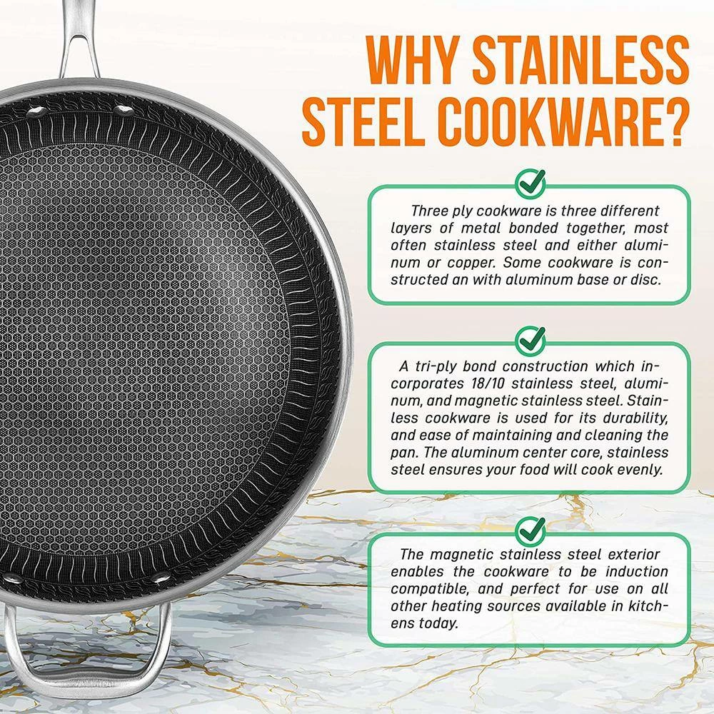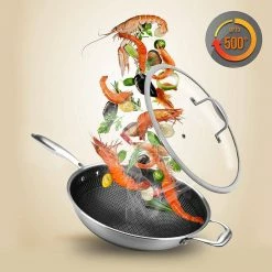 The PFOA/PFOS-free non stick 12 in. wok cooking ware features a stainless steel material with long-lasting DAKIN etching non-stick coating inside and outside for easy food release/ tossing, cleaning, healthy cooking. The stainless steel cooking wok features raised-up honeycomb fire textured pattern that forms an outstanding scratch-resistant surface so it is safe to use metal utensils. Cooks like stainless steel with ease of non-stick cleanup.