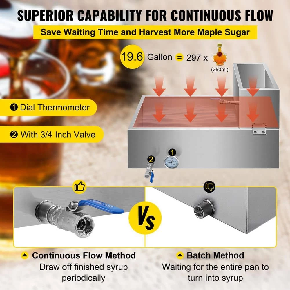 The VEVOR Maple Syrup Evaporator Pan This superior evaporator pan is made of 304 food-grade stainless steel, with brushed finished surface. It comes with a 3/4 in. threaded outlet, great for making maple syrup. The top edges of the pan are hemmed or “rolled” over. The extra reinforcement creates an exceptionally strong pan that makes it easy to handle.