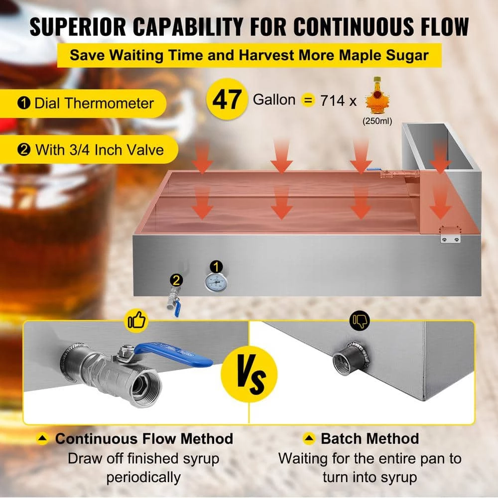 - Efficient Processing Flow: Handle nearly 47 gal. of sap in total, meaning 714 bottles of 0.07 gal. maple syrup can be made. The maple syrup pan comes with a 3/4 in. valve to adjust the flow rate and load the maple syrup into other containers. It is equipped with a precise thermometer, helping you monitor the temperature of maple sap