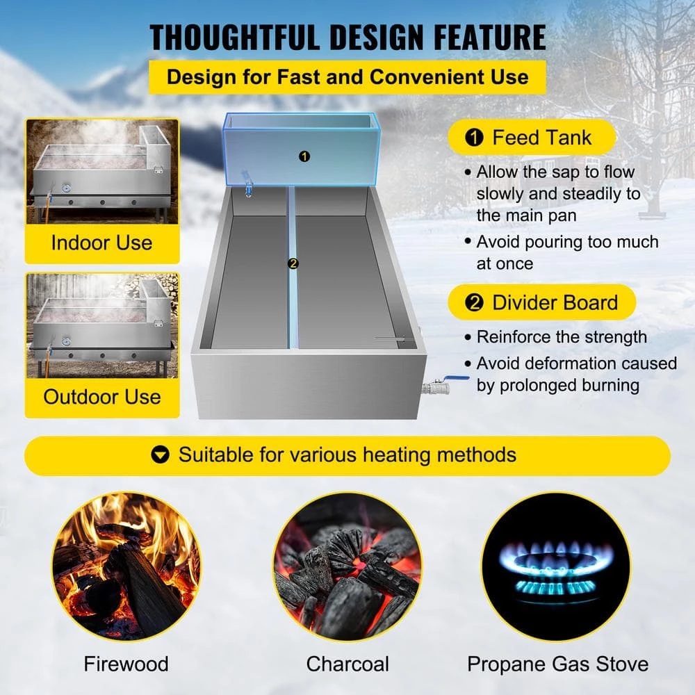 - Considerate Design: The addition of a feed tank and a divider board plays an important role. The feed tank can preheat part of the sap; the divider board can reinforce the strength to avoid deformation after burning for too long. This syrup pan is suitable for outdoor or indoor use and supports many heating fuels: firewood, charcoal, propane gas stove, etc