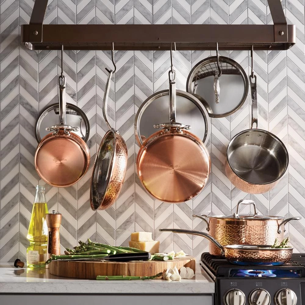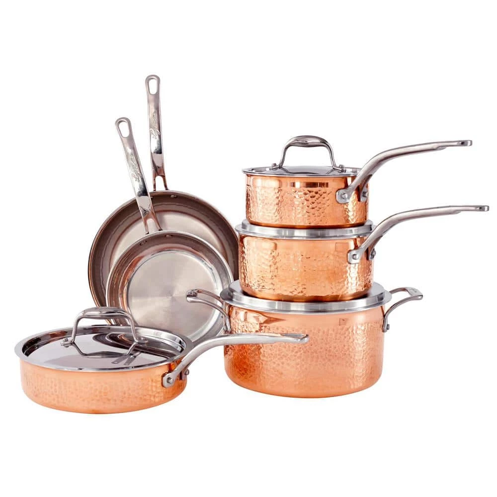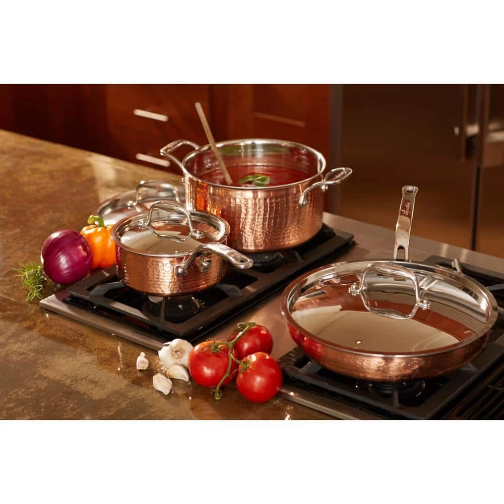 The Martellata copper 10 piece set is inspired by generations of passionate Italian cooking. With a beautiful hammered copper exterior and a stainless steel interior, pans look stunning in the kitchen and on the table. The tri-ply stainless construction provides even heat throughout the entire pan while the copper exterior heats and cools quickly, great for fast boiling or making delicate sauces. Topped with polished stainless steel lids and riveted handles, these pans look great and are built to last for a lifetime of memorable meals. Pans are oven and broiler safe for versatile cooking. The set includes all of the basic pans you need to cook a delicious meal for a crowd: 8 skillet, 10 skillet, 2 Qt. Saucepan with lid, 3 Qt. Saucepan with lid, 3 Qt. Deep saute with lid, 6 Qt. stockpot with lid.
