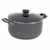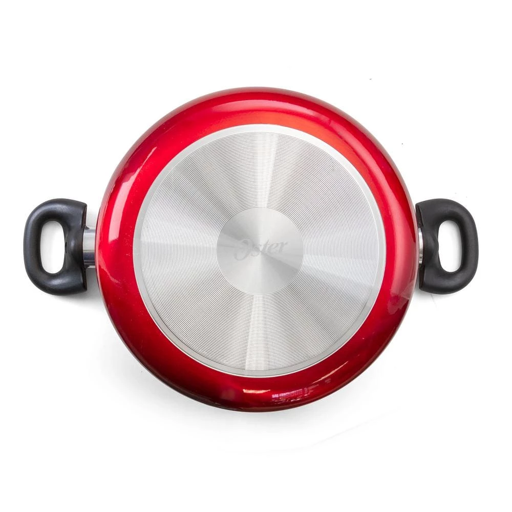 The Gibson Oster Merrion 6 Quart Aluminum Dutch Oven with Glass Lid in Red lets you Whip up delicious meals for your family and friends. The non-stick coated interior allows for healthier cooking as it requires little to no fat, and the food will slide right off the pot, making cleaning a breeze. The Bakelite handles remain cool to the touch to prevent burns and scalds. For added convenience, you can quickly monitor the cooking process through the vented tempered glass lids.