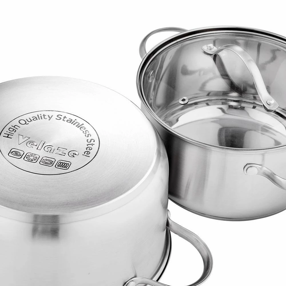 This cookware set from Velaze has all the essentials any kitchen needs. Featuring sleek, high-grade polished stainless steel bodies, these pot are sturdy and provide long-lasting durability. The generous handles offer a secure, comfortable, heat-resistant hold and come permanently secured with rivets. The cookware can be used on all stoves, including induction, and it’s oven-safe up to 500° F (260° C). It’s also dishwasher-safe for easy cleaning.