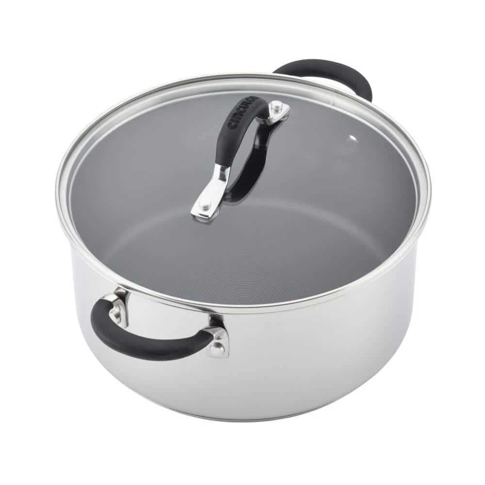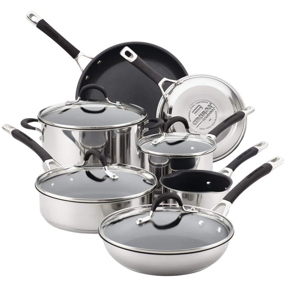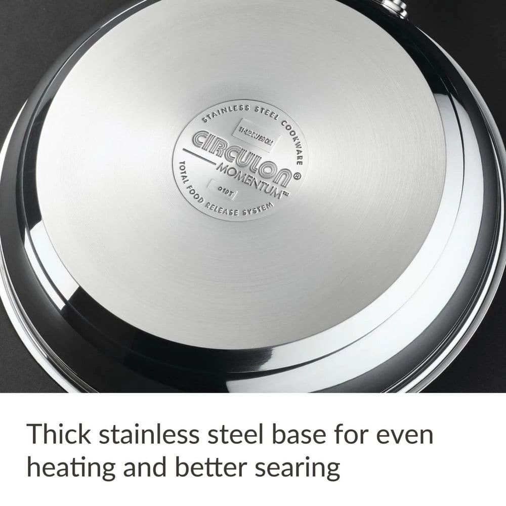 Empower the kitchen for cooking and cleaning efficiency with the all-range, dishwasher-safe Circulon Momentum 11-Piece Stainless Steel Nonstick Cookware Set. Circulon Momentum cooking sets are engineered with superior nonstick technology and time- and energy-saving convenience. An innovative cookware base features an aluminum core fully encapsulated with magnetic stainless steel for exceptional heating and cooking on all stoves, including induction. Best of all, the nonstick pots and pans are dishwasher safe for the ultimate in convenient cleanup. The pots and pans feature the PFOA-free TOTAL Nonstick System with premium metal-utensil-safe nonstick on raised circles, so foods release and cookware interiors clean with ease. Finishing details include silicone-enhanced stainless steel handles double-riveted for a comfortable, confident handhold and shatter-resistant glass lids. Oven safe to 400°F, the nonstick pots and pans set includes a 1-quart pouring saucepan, 2-quart saucepan with lid, 3-quart saute pan with lid, 6-quart stockpot with lid, 10-inch frying pan with lid, and 8-inch and 11.5-inch frying pans. Shift to the next level of kitchen convenience with the versatile and dishwasher-safe Circulon Momentum 11-Piece Stainless Steel Nonstick Cookware Set.
