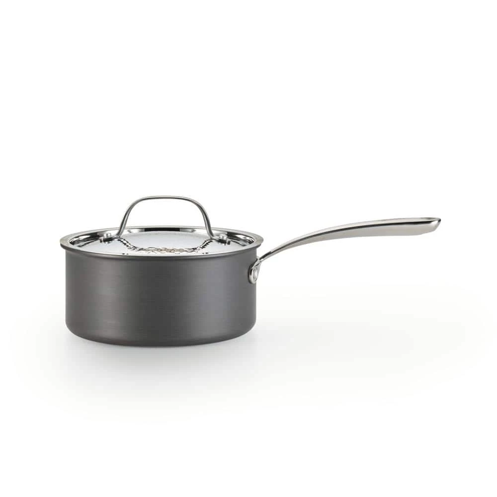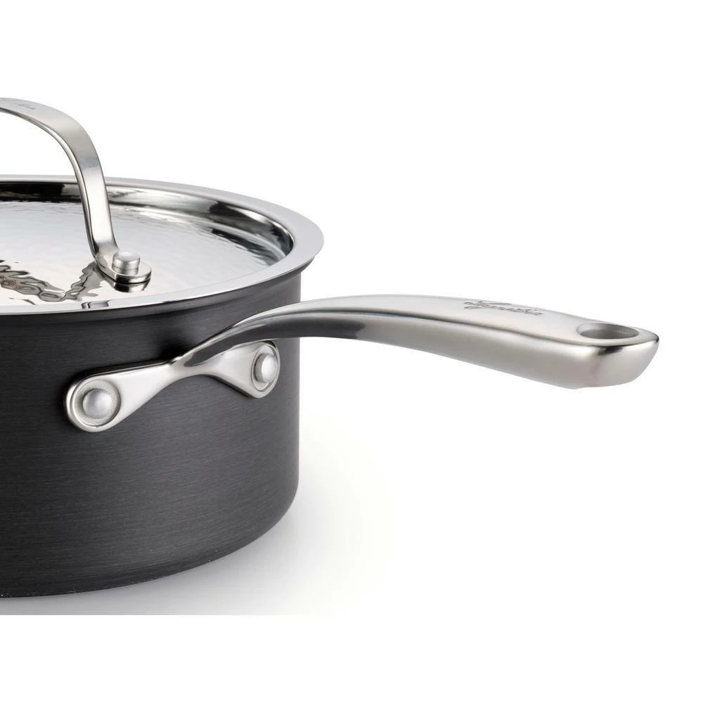 The LAGOSTINA Nera Hard Anodized 2 Qt. Saucepan comes with a hammered stainless steel lid and is inspired by generations of passionate Italian cooking. With a cast riveted stainless steel handle, the saucepan looks stunning in the kitchen and on the table. The comfortable stay-cool handle is built for strength and stability over a lifetime of use. The dual-layer, metal-utensil safe nonstick interior makes the cooking experience more enjoyable and the cleanup quick. The hammered stainless steel lid adds another beautiful feature and provides a tight seal to lock in flavor while simmering. The saucepan can withstand oven temperatures up to 500°F, providing cooking versatility. This saucepan is destined to be your go-to kitchen helper. Covered by a Lifetime Warranty.