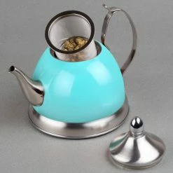 This stainless steel tea kettle is crafted of high quality heavy gauge stainless steel with 1.0 qt. Capacity. High quality stainless steel body with Aqua Sky Color finish. Includes a removable stainless steel tea infuser basket. Kettle heats up quick and retains heat well. Aluminum capsulated bottom provides even heat distribution. Can be used directly on any stove top or just pour your boiling water through the stainless steel infuser. Elegant and stylish design. Aqua Sky Color on body, brushed finish on lid and bottom rim.