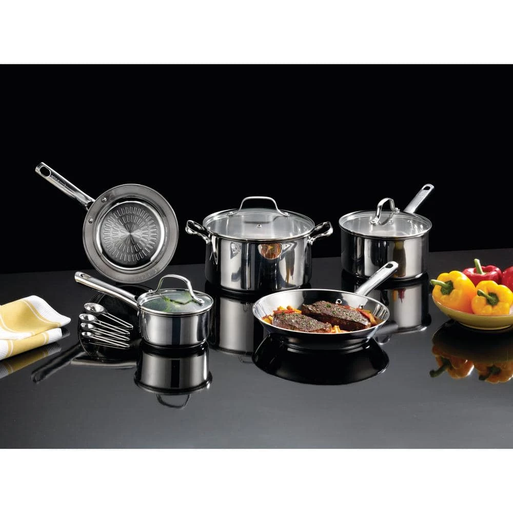 - Includes: 8 in. and 10.5 in. Frypans, 1 qt. and 3 qt. Covered saucepans, 5 qt. Dutch oven and 4 stainless steel measuring spoons