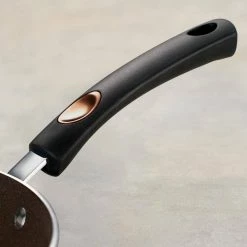 Longing for a warm, homecooked meal. The Tramontina “Pots & Pans” 8 in. Aluminum Nonstick Fry Pan is the perfect kitchen tool to make a quick batch of eggs or a delicious, hot dish for one to two people. Its heavy-gauge construction allows for a reliable uniformity across the pan, while the durable metallic black porcelain enamel exterior ensures years of use. The nonstick interior finish is metal utensil safe, made without PFOA and makes clean-up incredibly easy, while the speckled copper color adds a contemporary flair to your kitchen. This fry pan also has a riveted, soft-grip silicone handle to help cooks avoid dropping and spilling the dish they gave their all. The Tramontina “Pots & Pans” 8 in. Aluminum Nonstick Fry Pan is dishwasher safe, compatible with gas, electric and ceramic glass cooktops, is oven-safe up to 350°F / 176°C, and includes a lifetime warranty. Made in China.
