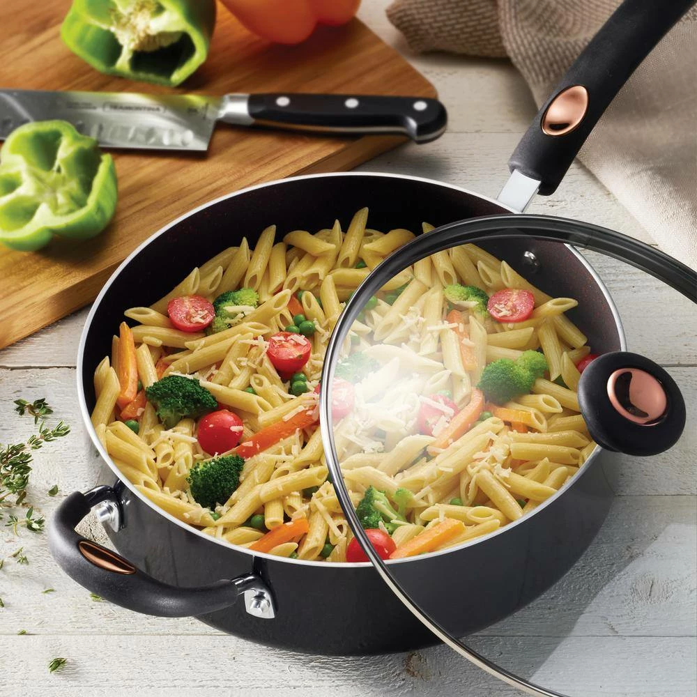 Whether you’re whipping up a hot dip for a party or recreating your mom’s chili recipe for the family, the Tramontina “Pots & Pans” 5.5 Qt Aluminum Nonstick Jumbo Cooker is the tool for you. Its heavy-gauge construction allows for a reliable uniformity across the pan, while the heat- and shatter-resistant tempered glass lid with stainless steel rim and soft-touch knob helps keep the heat in to achieve the perfect temperature. Its durable metallic black porcelain enamel exterior ensures years of use and adds a contemporary flair to your kitchen. Clean-up is made easy thanks to the metal utensil safe, copper speckled nonstick interior finish made without PFOA. This Jumbo Cooker also has a riveted, soft-grip silicone long handle, and helper handle to help cooks avoid dropping and spilling the dish they gave their all. The Tramontina “Pots & Pans” 5.5 Qt Heavy-Gauge Aluminum Jumbo Cooker is dishwasher safe, compatible with gas, electric and ceramic glass cooktops, is oven-safe up to 350°F / 176°C, and includes a lifetime warranty. Made in China.