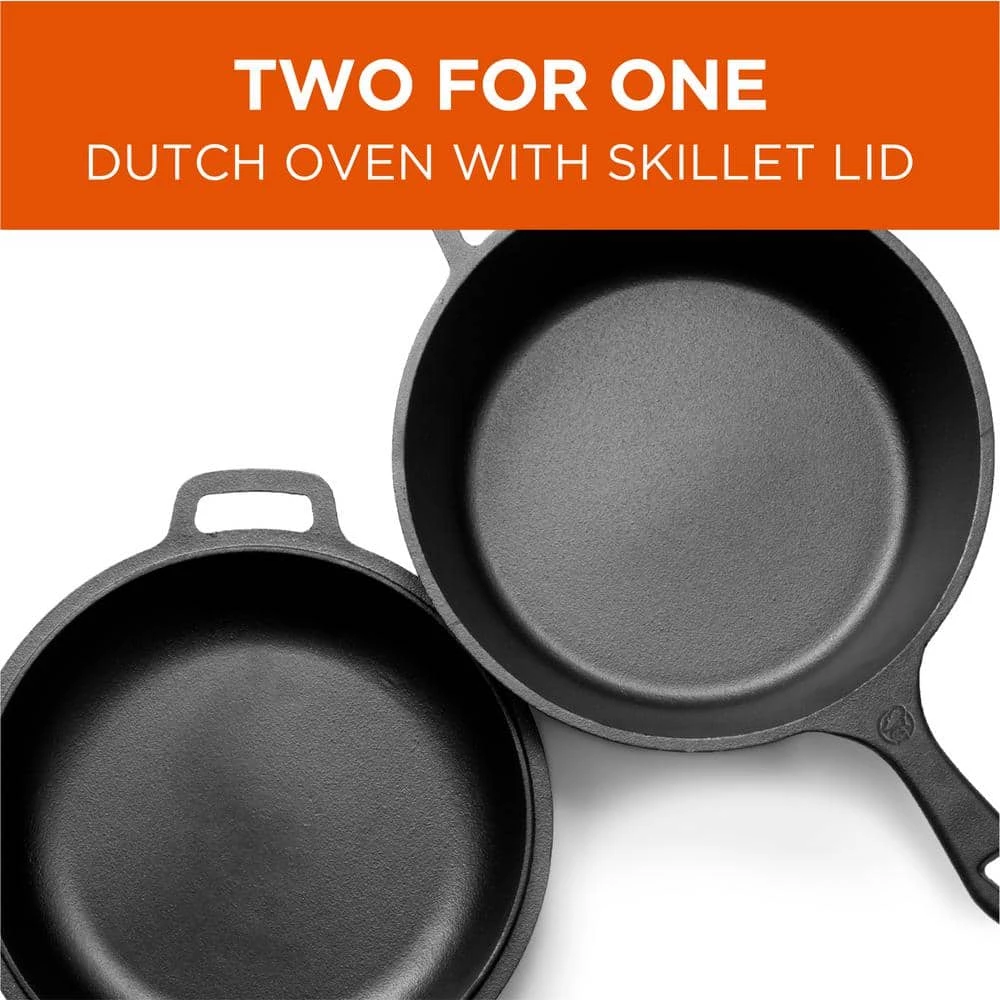 This 3-quart cast iron Dutch oven is a must-have for your kitchen. As a 2-in-1 combo, you can use the deeper pan for soups, stews and bread and the shallow lid as a skillet. Use this cast iron pot indoors or outdoors over a campfire or grill. Complete with integrated handles for easy lifting, control and hanging storage, our seasoned Dutch oven provides excellent heat distribution as well as retention for consistent, even cooking. It offers an abundance of possibilities. Use your new cast iron pot with lid to sear, saute, bake, broil, braise, fry or grill. Our cast iron pot 3-quart comes pre-seasoned with oil for an easy-release finish that improves its use. Simply hand wash with gentle detergent and dry thoroughly with a towel for easy maintenance. Hang or store your cooking pot in a dry, easily accessible spot in your kitchen or pantry.