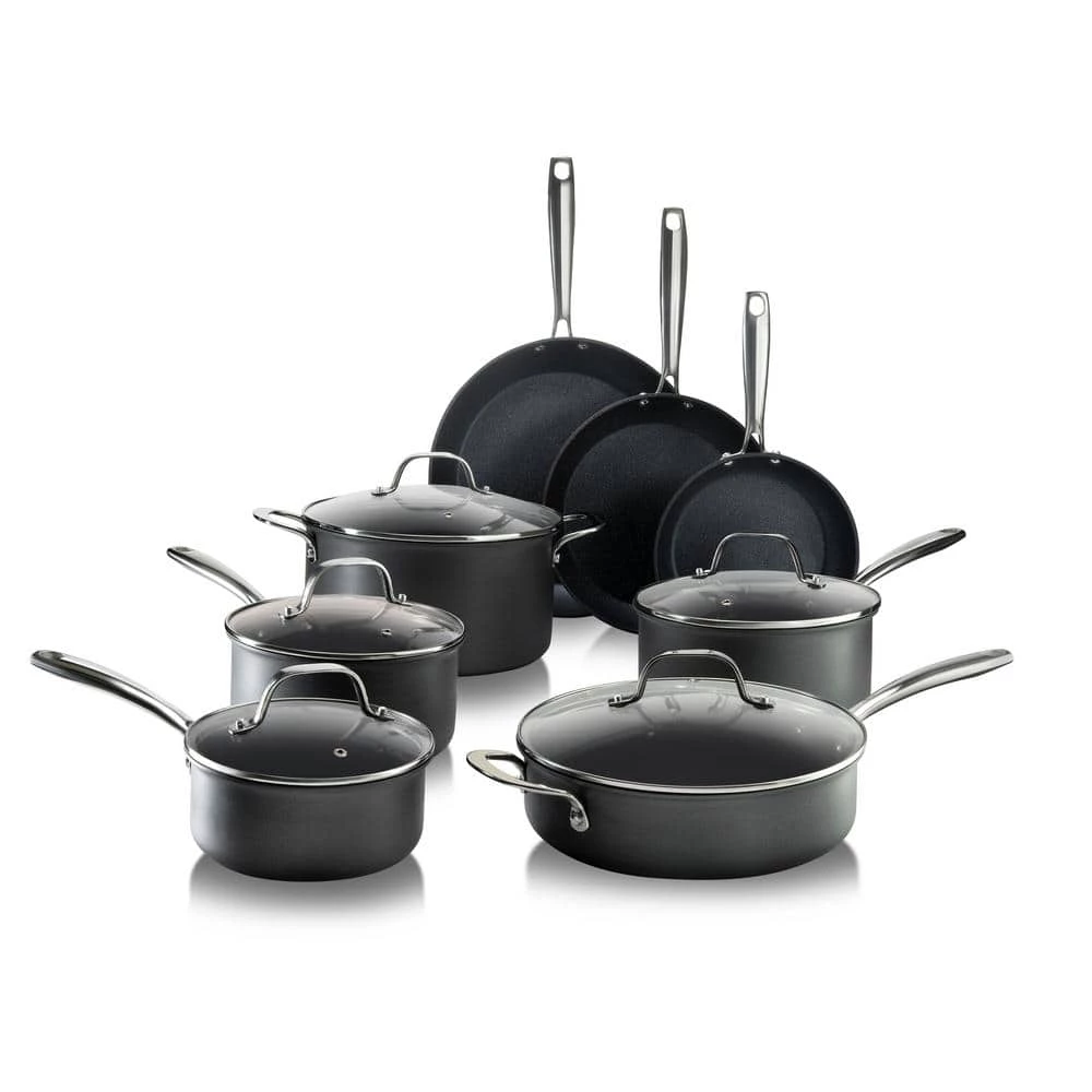 GraniteStone Professional Series 13 Piece Hard Anodized Set, stronger than stainless steel cookware, hard-anodized aluminum exterior is dense, nonporous, and highly wear-resistant for the ultimate professional performance. The 2.8 MM thick Anodized base is built to withstand the toughest cooking scenarios. The base is designed to absorb high heat and retain and disperse it evenly across the entire pan. No hot spots, No warping. So you your food cooks better & your cookware lasts longer. A Superior Base, For a Superior Cooking Experience. Induction base can be used on both gas or electric cooktops.