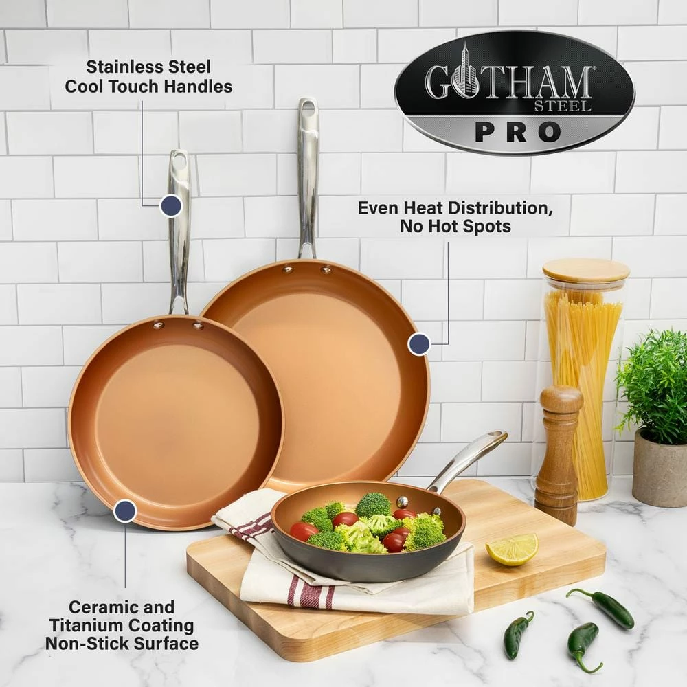 - Premium nonstick cooking surface reinforced with the Gotham Steel Titanium and Ceramic delivers the ultimate food release. No oil or butter needed makes for healthier eating, and provides for hassle free, easy cleanup.