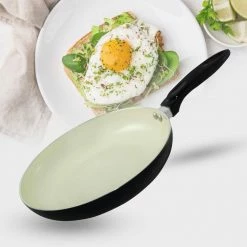 Made of heavy gauge 3.0 mm aluminum with off-white ceramic non-stick interior coating. Ceramic is the perfect way to stay eco-friendly and non-toxic, while being extremely durable and dishwasher safe. Handles are made with Bakelite and features a flame guard.