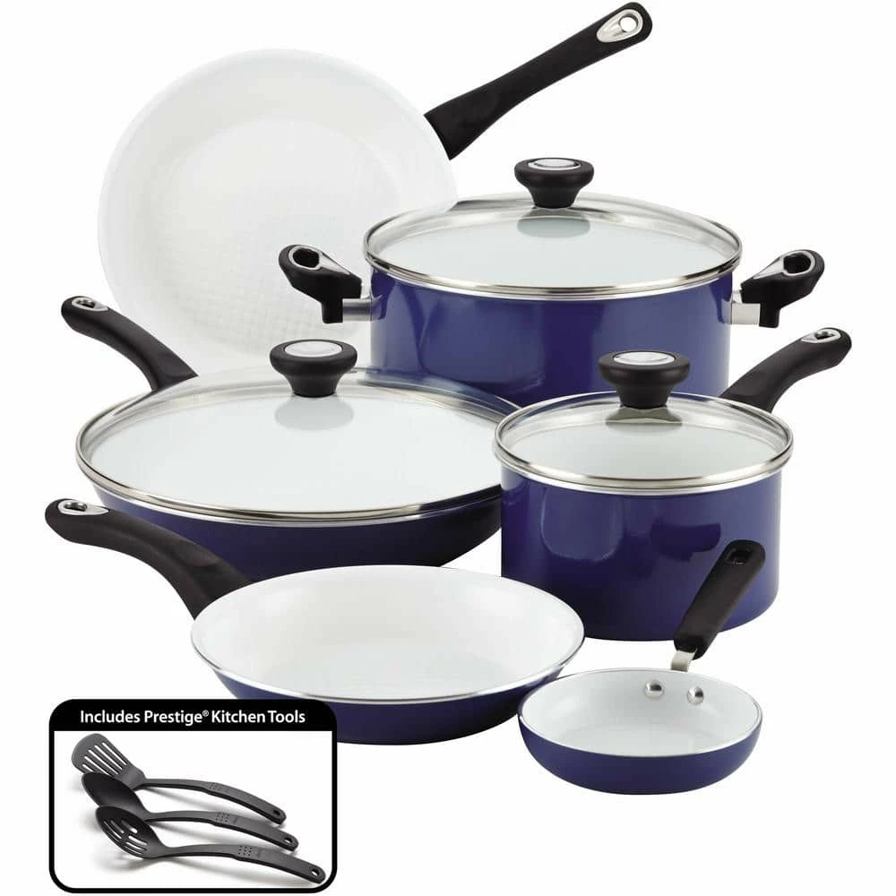 Freshen up easy, everyday meal-making with the brilliant performance of the durable and dishwasher-safe Farberware PURECOOK Ceramic Nonstick 12-Piece Cookware Set. Featuring a 2-quart saucepan with lid, a 5-quart dutch oven with lid, a 5-inch mini frypan, 8.5-inch and 10-inch frying pans, an 11.5-inch frying pan with lid, and a slotted turner, slotted spoon, and solid spoon, this nonstick cookware brings on performance and style in a fresh white color for a bright, bold look. Ever-dependable Farberware aluminum construction heats fast and evenly, and the larger frying pans feature a quilted nonstick cooking surface to boost food release where it matters most. The colorful porcelain enamel exteriors are stain-resistant and easy to clean, and the cookware’s sturdy handles sport distinctive stainless steel accents. Shatter-resistant glass lids hold in heat and moisture, and the cookware set includes a set of sturdy Prestige nylon tools ideal for use with the ceramic nonstick interiors. Oven safe to 350°F, this Farberware cookware set includes a Farberware Lifetime Limited Warranty. Get the cooking performance trusted by generations with a modern boost of style and nonstick cooking performance using the durable, dishwasher-safe Farberware PURECOOK Ceramic Nonstick 12-Piece Cookware Set. .