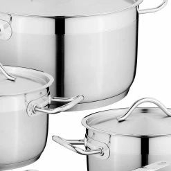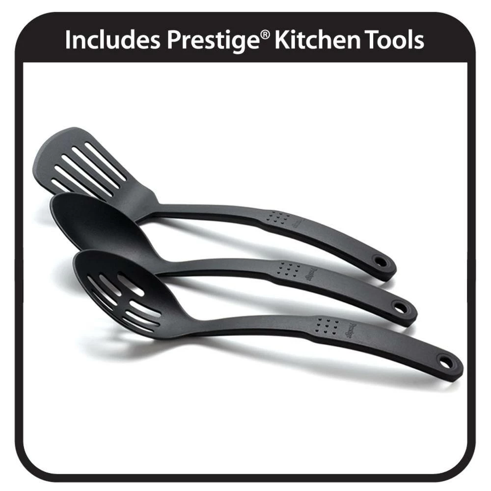 - STURDY, VERSATILE POTS AND PANS: The pots and pans feature sturdy handles with distinctive stainless steel accents; set includes three Prestige cooking tools