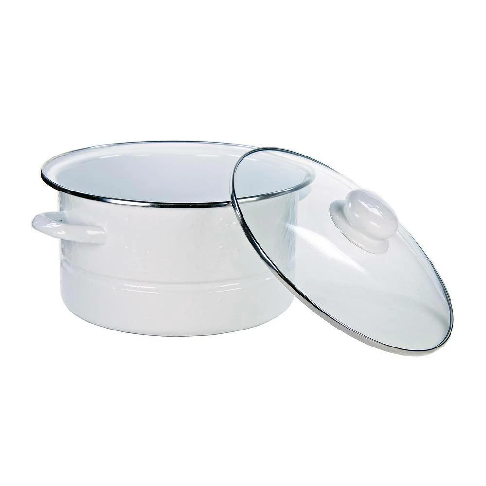 6 qt. Stock Pot, 5 in. deep x 9.25 in. wide interior This enamelware is made of carbon steel coated with a porcelain enamel and trimmed in stainless steel. There will be variations in the shading of colors and pattern formations which are the results of the hand-dipped process. The swirl design is a classic, retro staple for enamelware cookware and serveware. The contrast of colors creates a distinct look and brings a casual artistic flair to your table setting. Each piece is individually hand crafted and is as unique as you are. Skilled artisans hand dip the white background color, then use a brush to hand apply the secondary color swirls. This creates a unique piece and design each time. The elegant and inviting aesthetic draws the eyes into the many spattered patterns flowing throughout. Your piece will be one-of-a-kind and exclusive to you as you create your own distinctive style.