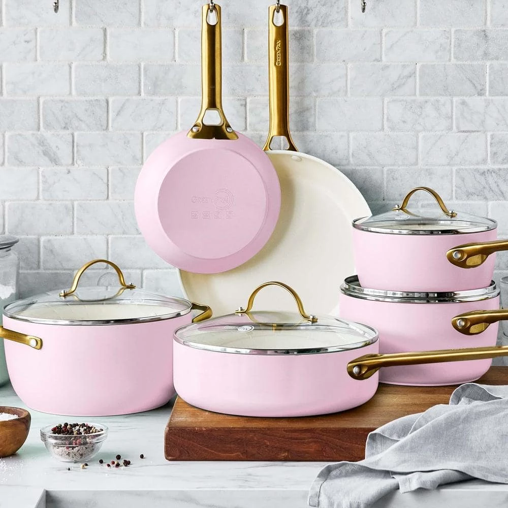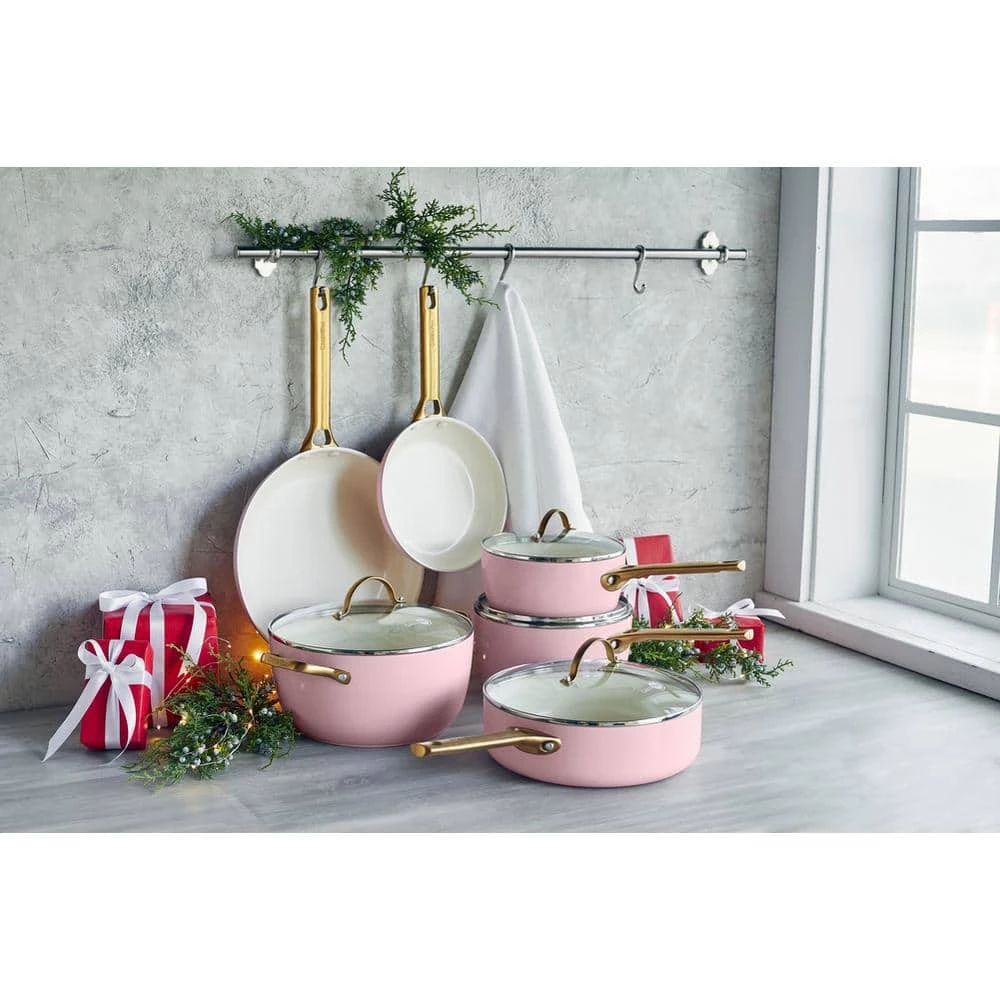 World-class performance meets minimalist chic in the GreenPan Reserve collection. These eye-catching pans are designed to stay beautiful- the collection’s duo forged hard anodized aluminum construction makes each of the pots and pans extra tough and scratch-resistant while also promoting even heat distribution for consistent cooking. Each pan features our Thermolon healthy ceramic nonstick coating, reinforced with diamonds to make it ultra-durable and heat responsive. Our ceramic nonstick coating helps you make any meal healthier because it’s free of PFAS, PFOA, lead, and cadmium and will never release toxic fumes, even when overheated. Durable glass lids give you an easy view of your meals and the matte stainless-steel handles make each pan easy to take from the stovetop to the oven. Dishwasher safe. Oven safe up to 600°F. This cookware set includes 8 in. and 11 in. frypans, 2 qt. Saucepan with lid, 3 qt. saucepan with lid, 3.3 qt. Saute pan with lid, and 5 qt. stockpot with lid. Limited lifetime warranty.
