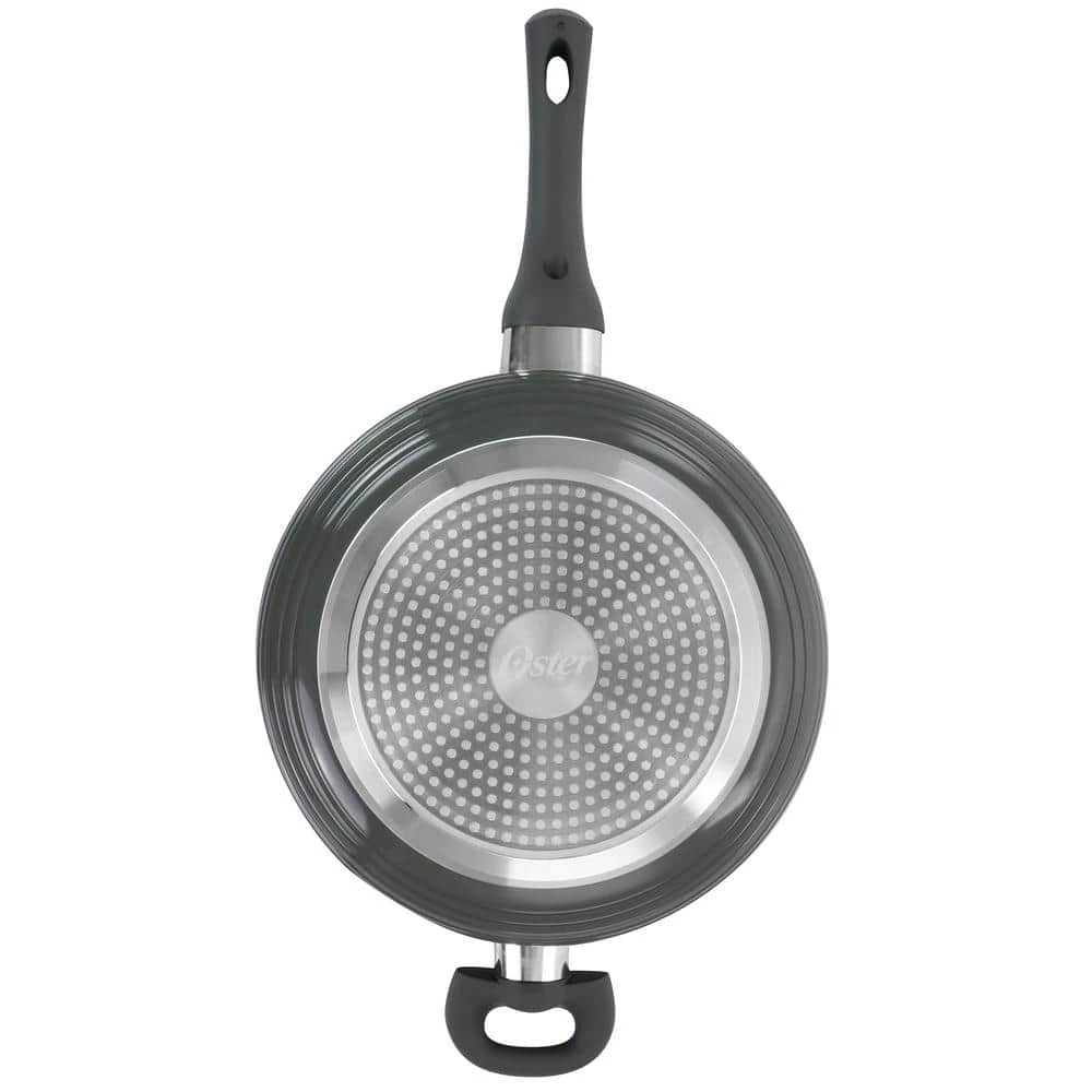 Cook all your favorite meals with the Oster 3.5 qt. Nonstick Aluminum Saute Pan in Gray. Cooking made easy with the nonstick ceramic coated surface. Perfect for low fat cooking and easy clean up. Saute all your favorite meals back to back with the soft touch, Bakelite handle and knob that stays cool while you cook. Vented tempered glass lid for monitoring all your cooking progress. The heavy gauged Aluminum body provides strength and durability. Make this the perfect addition to your home kitchen and compliment your cookware collection.