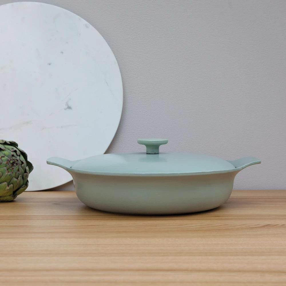 11 in. /3.5qt Green Covered Deep Skillet is made of Cast iron which has great heat retaining abilities: it’s the perfect choice for slow cooking and for hearty stews prepared in the oven or on the stovetop. The cover locks in the moisture and small bumps on the interior make sure the evaporated juices are directed on to the food for extra tasty results. Only little oil is needed with this pan: the perfect option for low-fat frying. Wide handles for a safe grip, even when wearing oven mitts or using potholders. 11.5 in. White Tajine cover to fit the 11 in. cast iron deep skillet from our Ron collection. Turn the deep skillet into a tajine, perfect for real slow cooking and all traditional dishes. Traditional cone shaped lid, allowing the steam to re-condense into water droplets which fall back onto the ingredients for tender, moist results. Elegant design for stove top and oven to table use. Oven safe.