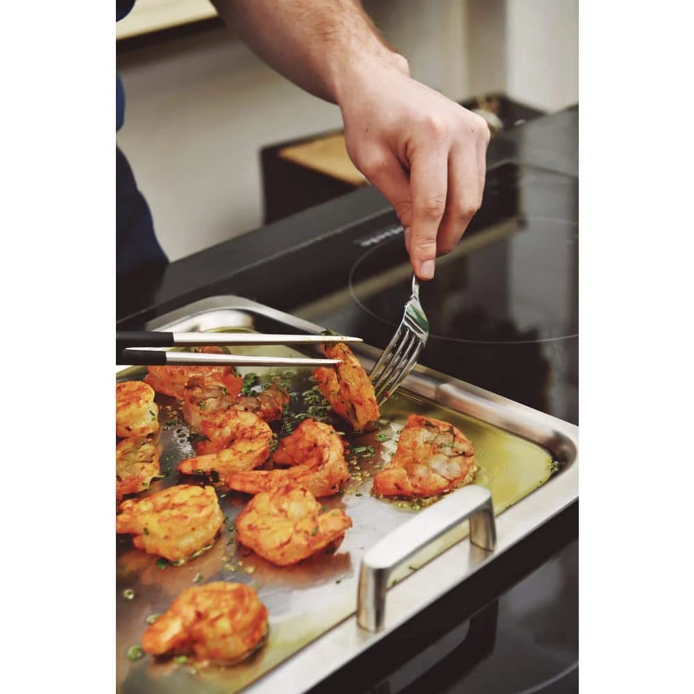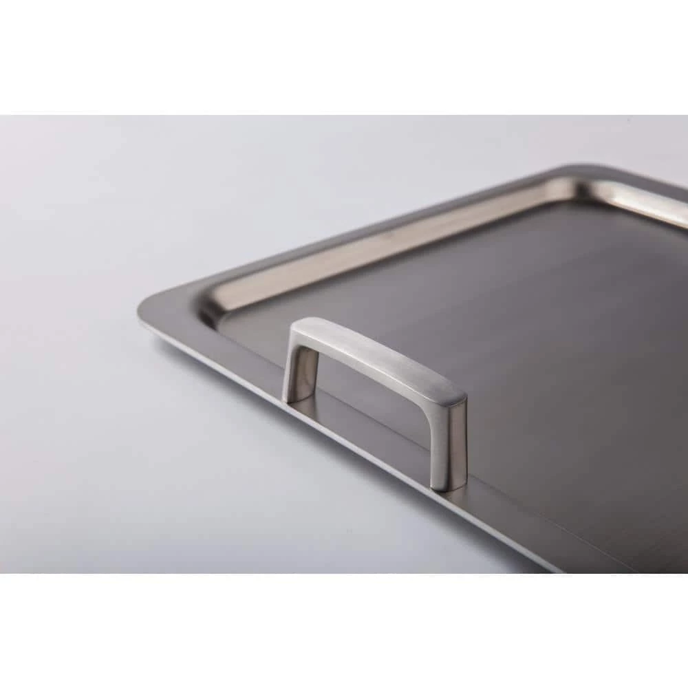 This 13.75 in. Teppanyaki plate is great for low-fat cooking since a minimum of fat is needed. Simply add a bit of suitable oil (olive oil splatters too much) and you’re cooking the most delicious recipes in no-time. 5-ply polished outside and satin-finished inside with stainless steel handles. Also, the pan is made with high quality 18/10 Stainless Steel.