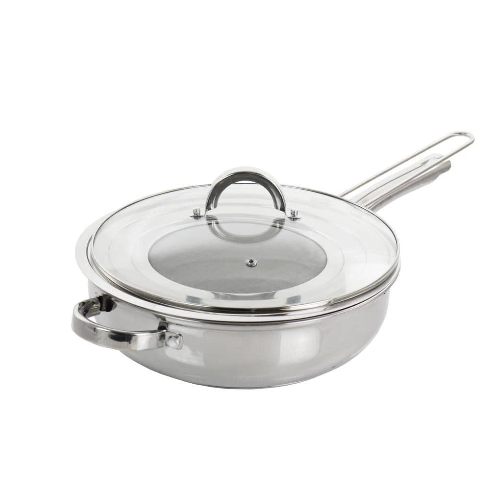 Saute exquisite meals and fry greasy foods with ease with the Oster Sangerfield 3 Piece 4 Quart Stainless Steel Saute Pan with Lid and Splatter Guard. This saute pan comes equipped with a stainless steel micro-mesh splatter guard, preventing grease from splattering while also allowing steam to escape. This cookware also comes with a vented tempered glass lid, allowing you to easily monitor the cooking process. This entire set is crafted from durable stainless steel and equipped with an encapsulated aluminum base. Feel free to cook with this saute pan on a wide range of heat options from; gas, electric, vitroceramic, and halogen. This saute pan is also hand wash recommended in order to maintain its quality and extend its lifetime in your kitchen.