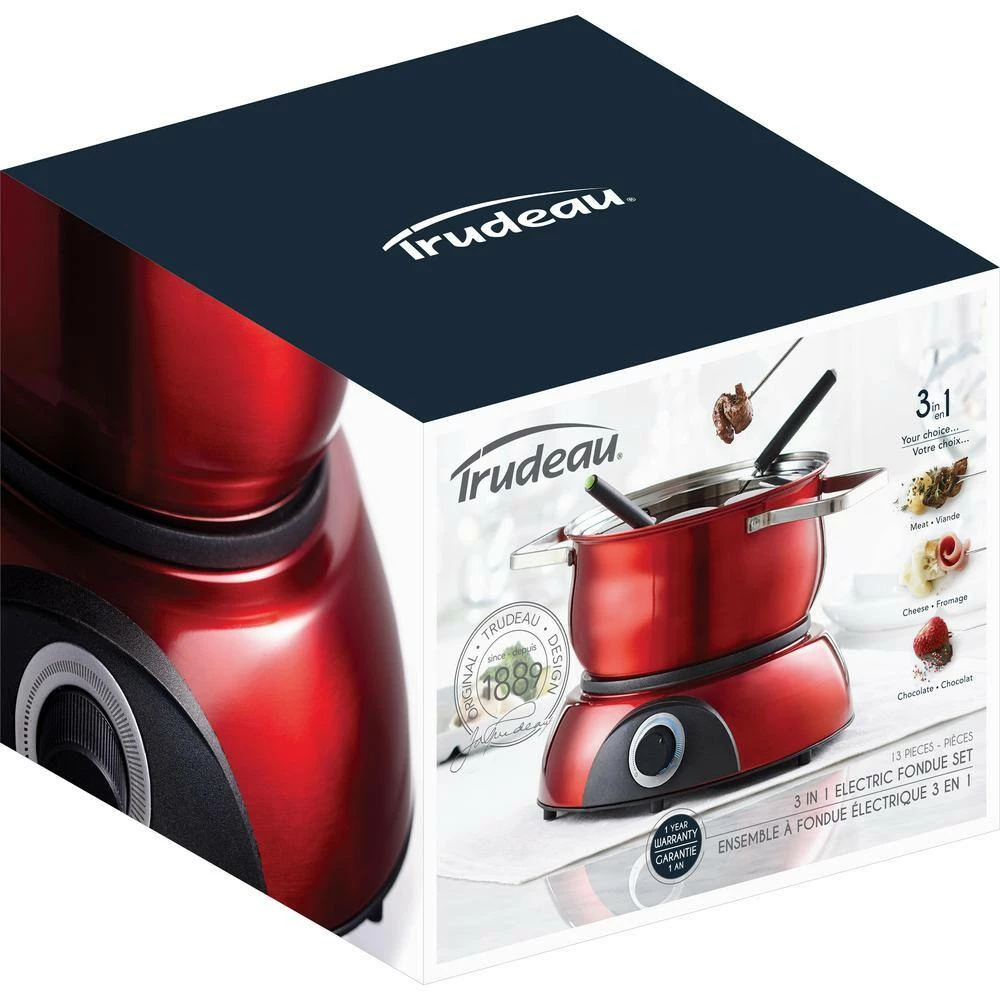 Keep the good times rolling with the Scarlet 3-in-1 Electric Fondue Set. Discover succulent fondue recipes and bring everyone together around for an evening of tasty treats. In the mood for savory meat, rich Swiss fondue, or decadent chocolate fondue. Simply adjust the thermostat and relax knowing you’ve got the perfect temperature setting for every course. Immerse your meat in the fondue pot or use the stoneware double-boiler for perfectly melted cheese or chocolate. Cleaning up is easy. Stainless steel color-tipped forks, a fork guide and a quick-release safety cord add to the long list of thoughtful features. There’s even a recipe booklet included. With a 84 oz. capacity, the Scarlet 3-in-1 Electric Fondue Set is made for delicious and fuss-free family time.