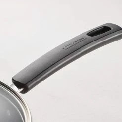 Tramontina Sicilia 2.5 qt. Aluminum Nonstick Covered Sauce Pan has room to reheat soups and prepare flavorful sauces for your meals. The even gauge construction and heavy-gauge aluminum exterior mean you’ll have this pan in your kitchen for years to come. The Starflon Excellent nonstick interior finish is Tramontina proprietary nonstick system, which makes clean up less stressful. The matching heat and shatter resistant tempered glass lid has a vent hole and stainless steel rim, allowing you to watch the process of your meal while it’s simmering. The long handles are Sicilia style stamped shank with over molded Bakelite, which means this sauce pan is not for oven use. This cookware is made in Brazil and available in several colors.