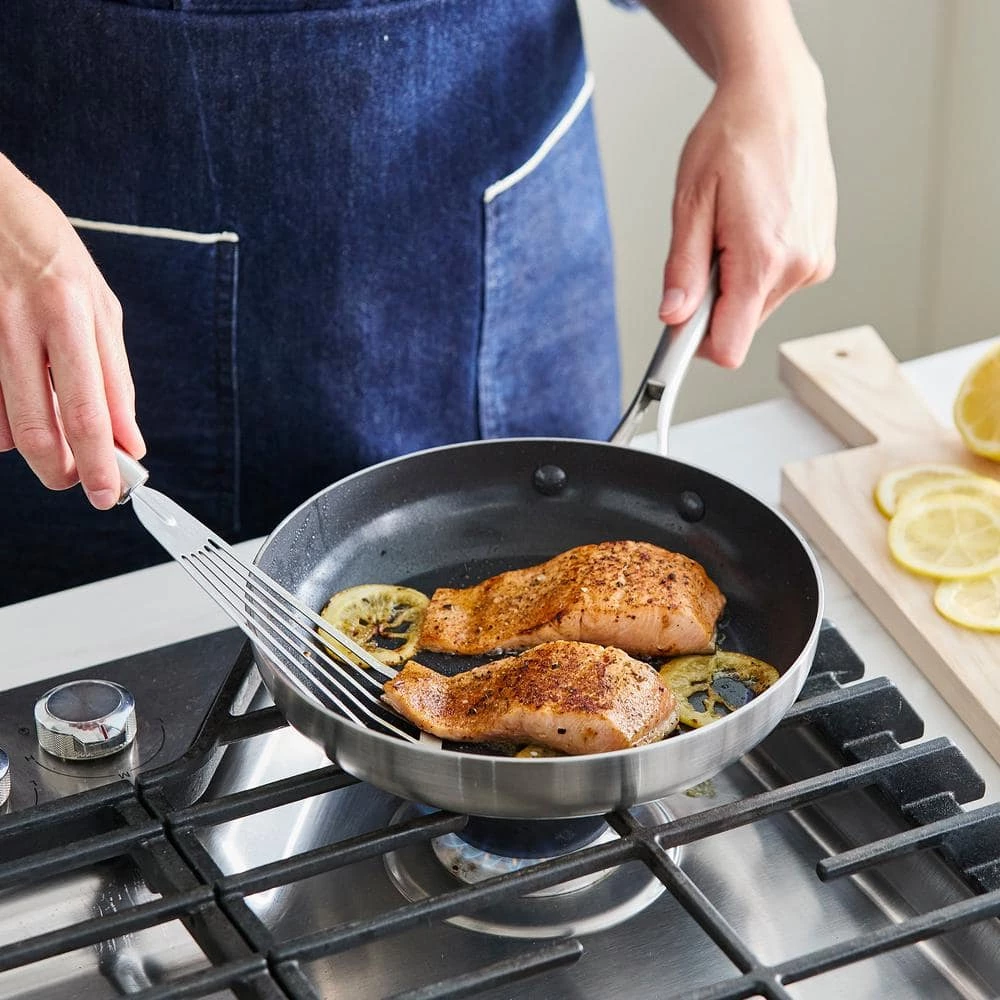 Shine on the stovetop with this tri-ply stainless steel set from Blue Diamond. Stainless Clad Pro features 2-stainless steel layers surrounding an aluminum core that extends throughout each pan to deliver responsive performance with unbelievable power. Our unique diamond-infused coating is an eye-catching update that works with the 3-ply body to promote fast and even heating, incredible durability, and dazzling results on all stovetops, including induction. The stay-cool handles keep the collection comfortable on the stovetop while their unique angle makes these pans stackable for easy storage. Glass lids provide an easy look at any meal in progress, and everything can be popped in the dishwasher for effortless cleanup. This cookware set includes: 8 in. and 9.5 in. frypans, 2.1 qt. saucepan with lid, 6.1 qt. stockpot with lid, 3 qt. saute pan with lid, bamboo slotted turner, bamboo solid spoon.