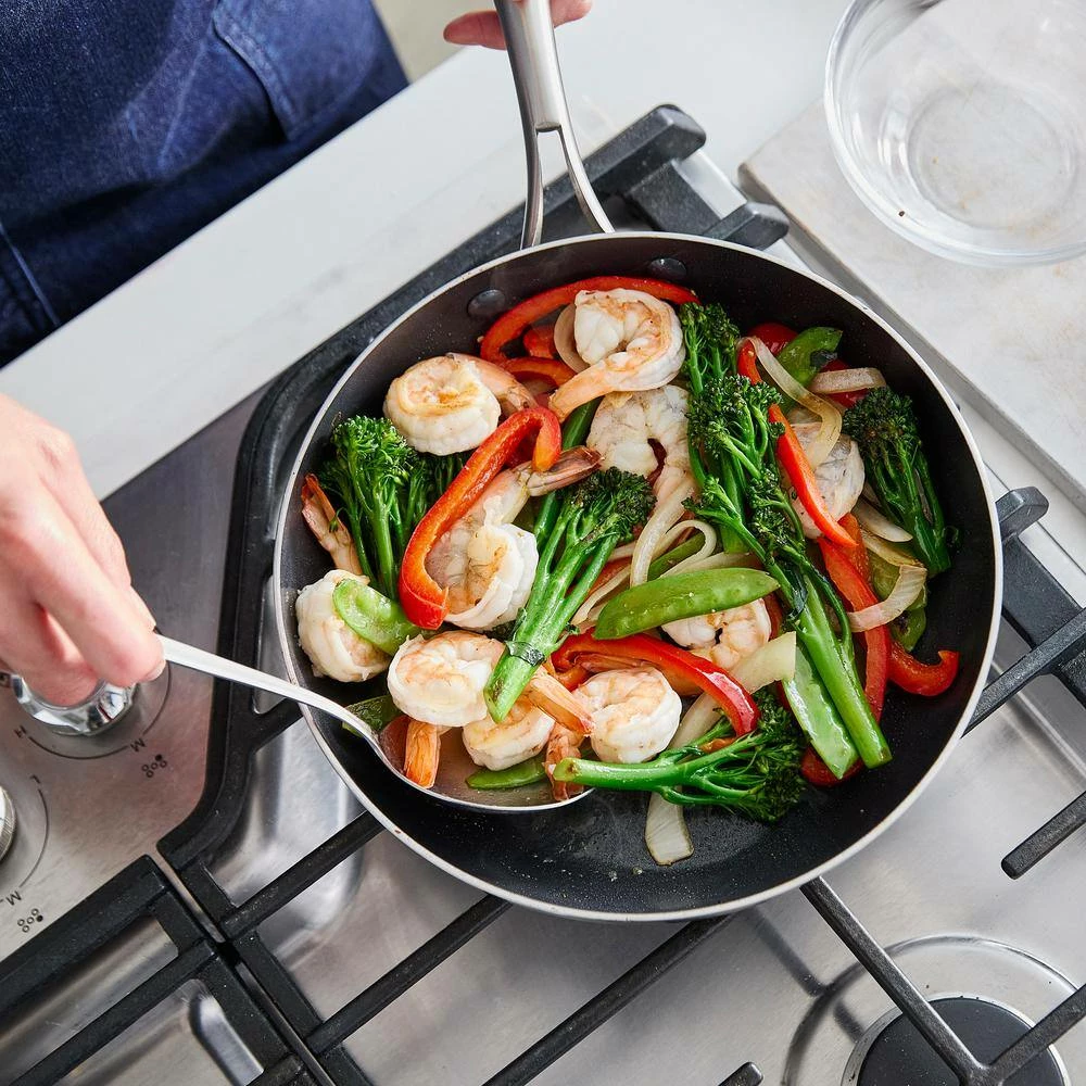 Shine on the stovetop with this tri-ply stainless steel frypan set from Blue Diamond. This pan is crafted with two stainless steel layers surrounding an aluminum core that extends up each side to deliver responsive performance with unbelievable power. Blue Diamond’s unique signature coating works with the 3-ply bodies to promote fast and even heating, incredible durability, and dazzling results on all stovetops, including induction. The stay-cool handles keep these pans comfortable on the stovetop while their unique angled design makes these pans stackable for easy storage.