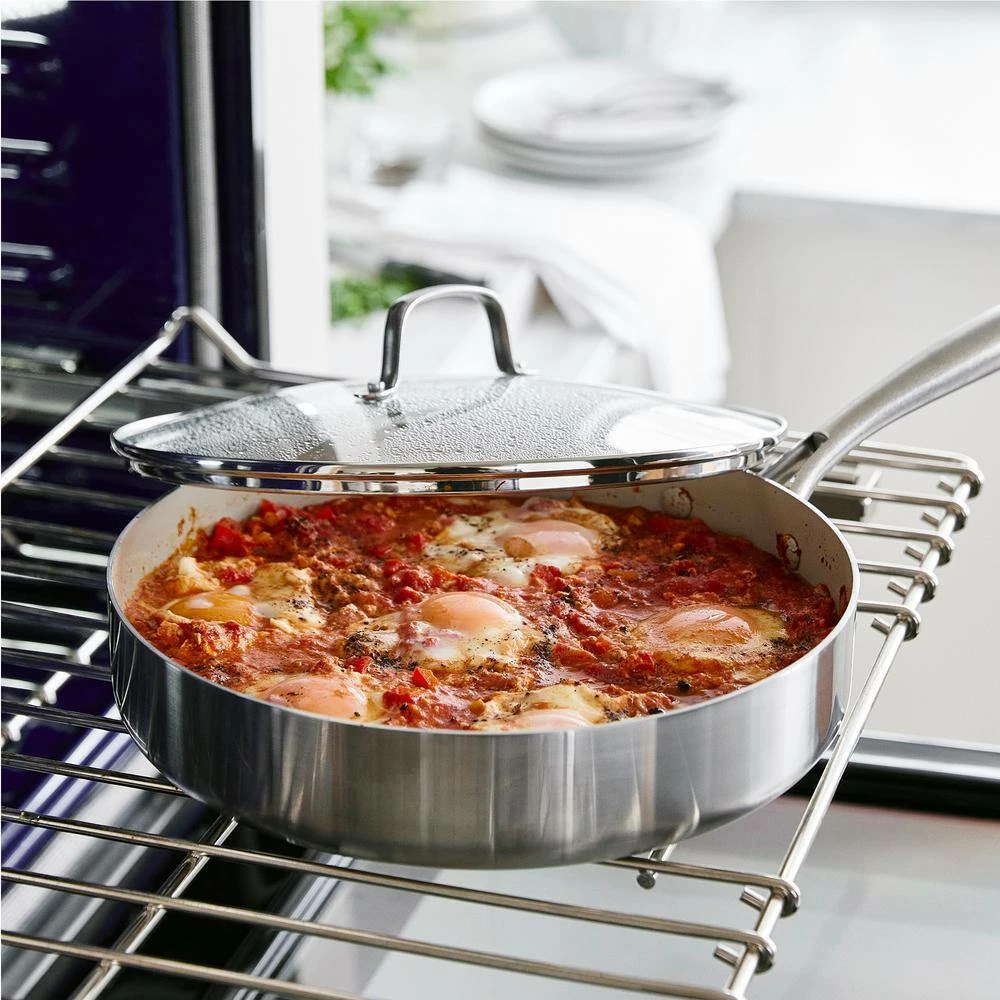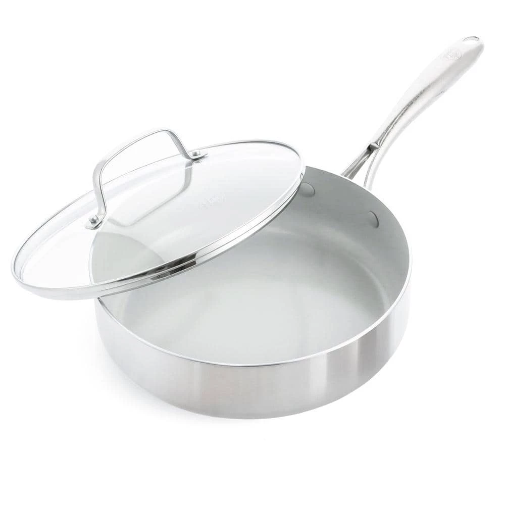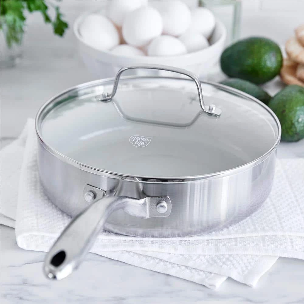 Your go-to pan just got a makeover-this 3-ply saute pan take on any kitchen task with room to spare. Featuring 2 layers of stainless steel surround an aluminum core, this collection heats quickly, evenly and performs as good as it looks. And it’s finished with our toxin-free ceramic nonstick coating, so everything you make will be a little healthier, too. That’s because our ceramic nonstick is not stuck in the past-our ceramic nonstick starts with sand and creates 60% fewer CO2 emissions during the curing phase than traditional coatings.