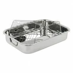 An essential piece of cookware for every family home, this stainless steel roasting pan with roasting rack is perfect for the holidays or that Sunday roast. This classically designed roasting pan is perfect for holding a turkeys, chickens or a roast. At 63 oz. and dimensions of 18 in. x 14 in. x 3 in., this stainless steel pan will fit into any conventional oven and is ready for induction. This product is dishwasher safe, so cleaning up after your evening roast should not be a problem at all. A special feature of this product is that it has a removable shelf that allows food to drain and has 2-durable hand les that helps with easy removal and carrying. The product is made from high quality stainless steel, so you know that your food will heat evenly. This is a great product for every home.