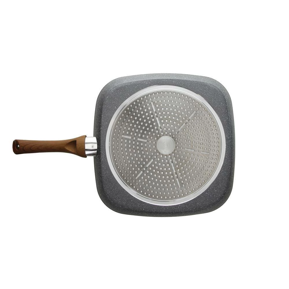 The Tognana Stone and Wood 11 in. Grill Pan is your go to pan at mealtime. It is manufactured of a forged aluminum body, allows for uniform heat distribution and has a soft touch handle. The non-stick coating is also scratch resistant and dishwasher safe. PFOA free and nickel free so you can rest assured it is a safe choice for you and your family.