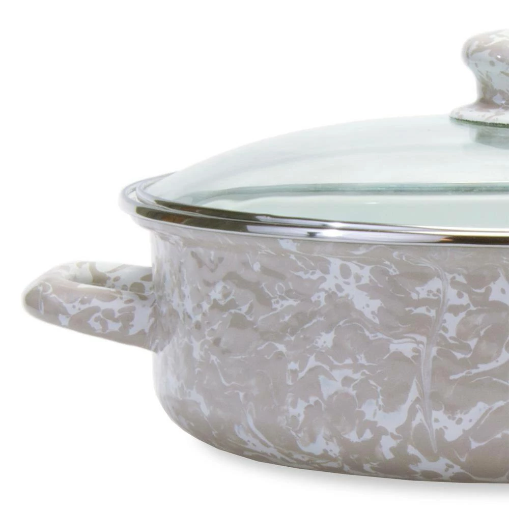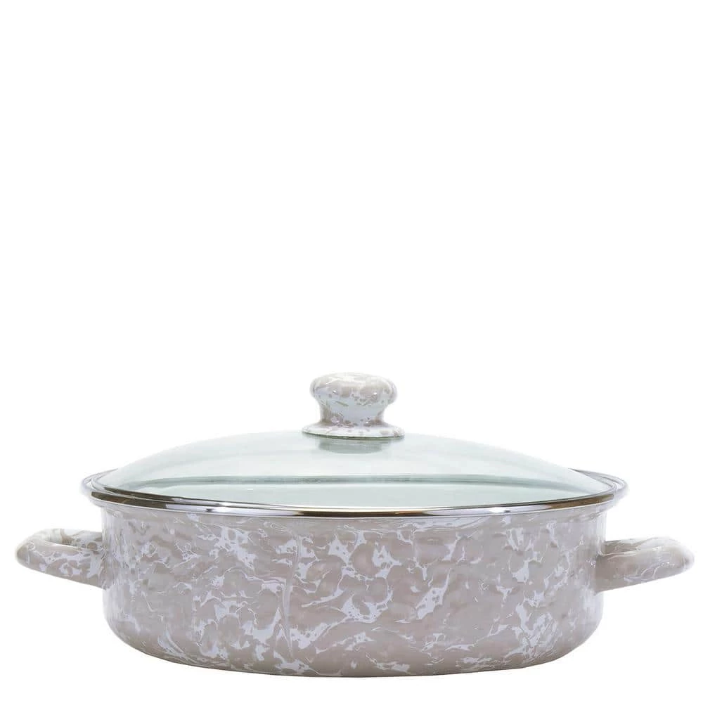 3 qt Saute Pan, 9.5 inch diameter, 2.5 inch deep. This enamelware is made of carbon steel coated with a porcelain enamel and trimmed in stainless steel. There will be variations in the shading of colors and pattern formations which are the results of the hand-dipped process. The swirl design is a classic, retro staple for enamelware cookware and serveware. The contrast of colors creates a distinct look and brings a casual artistic flair to your table setting. Each piece is individually hand crafted and is as unique as you are. Skilled artisans hand dip the white background color, then use a brush to hand apply the secondary color swirls. This creates a unique piece and design each time. The elegant and inviting aesthetic draws the eyes into the many spattered patterns flowing throughout. Your piece will be one-of-a-kind and exclusive to you as you create your own distinctive style.