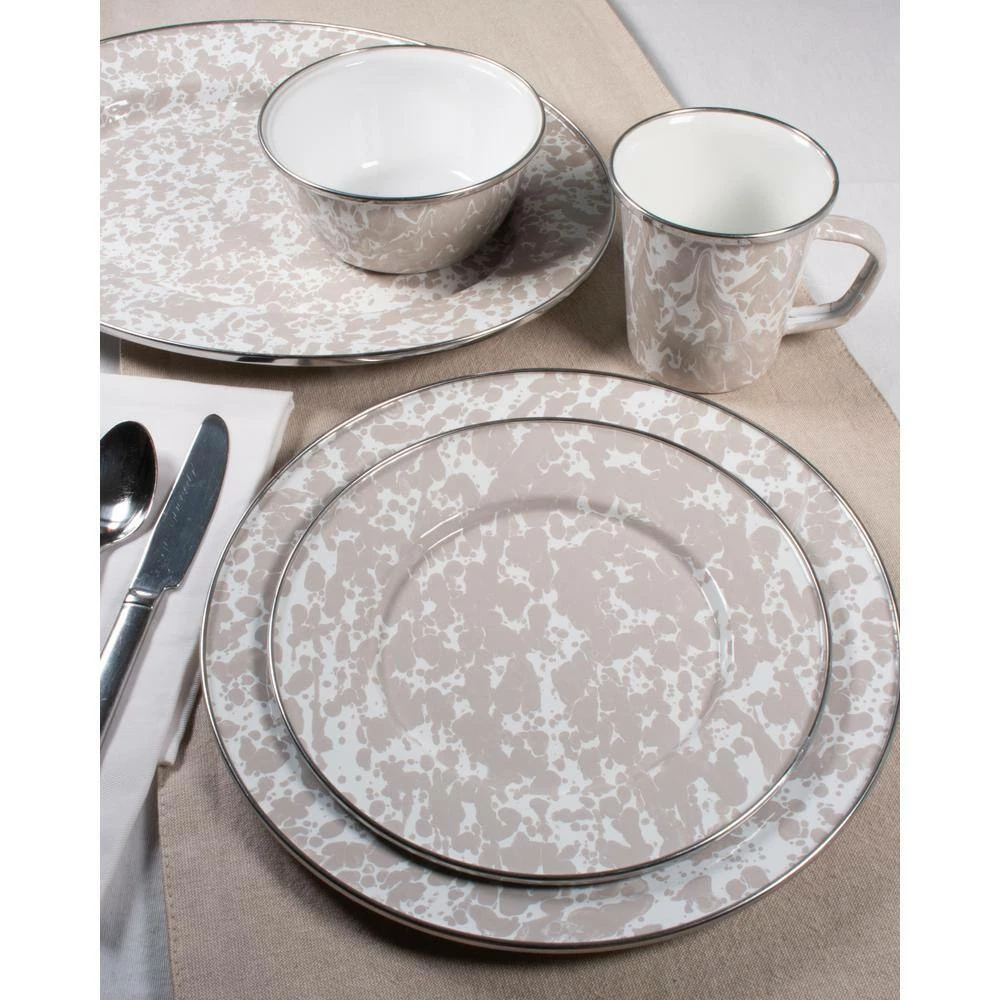 6 qt. Stock Pot, 5 in. deep x 9.25 in. wide interior This enamelware is made of carbon steel coated with a porcelain enamel and trimmed in stainless steel. There will be variations in the shading of colors and pattern formations which are the results of the hand-dipped process. The swirl design is a classic, retro staple for enamelware cookware and serveware. The contrast of colors creates a distinct look and brings a casual artistic flair to your table setting. Each piece is individually hand crafted and is as unique as you are. Skilled artisans hand dip the white background color, then use a brush to hand apply the secondary color swirls. This creates a unique piece and design each time. The elegant and inviting aesthetic draws the eyes into the many spattered patterns flowing throughout. Your piece will be one-of-a-kind and exclusive to you as you create your own distinctive style.