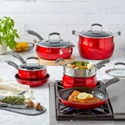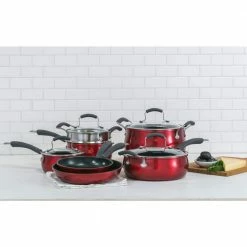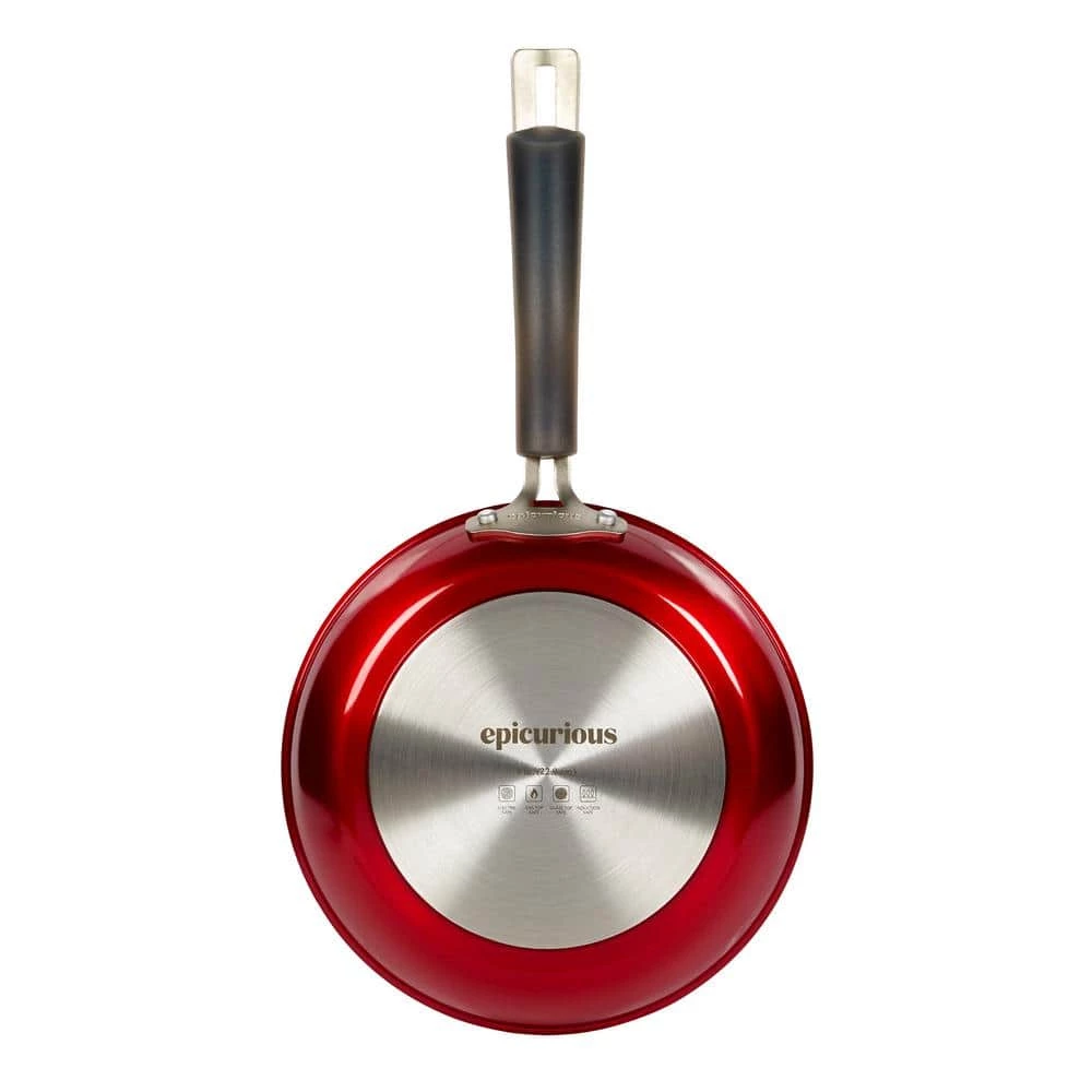 Epicurious 11-piece Aluminum Cookware Set. Make easy work of your daily cooking tasks with this aluminum nonstick cookware set. Made from heavy-gauge aluminum for unsurpassed heat distribution and durability. Unique belly shape provides enhanced heat and moisture circulation. Nonstick interior for excellent food release and easy cleanup. Safe for use with metal utensils. Tempered glass lids have stainless steel rims and allow you to monitor cooking without losing moisture or flavor. Silicone handles are double riveted for durability and stay cool to the touch.