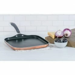 Epicurious 12 in. Aluminum Square Griddle. Make easy work of your daily cooking tasks with this aluminum nonstick griddle. Made from heavy-gauge aluminum for unsurpassed heat distribution and durability. Nonstick interior for excellent food release and easy cleanup. Safe for use with metal utensils. Silicone handles are double riveted for durability and stay cool to the touch.